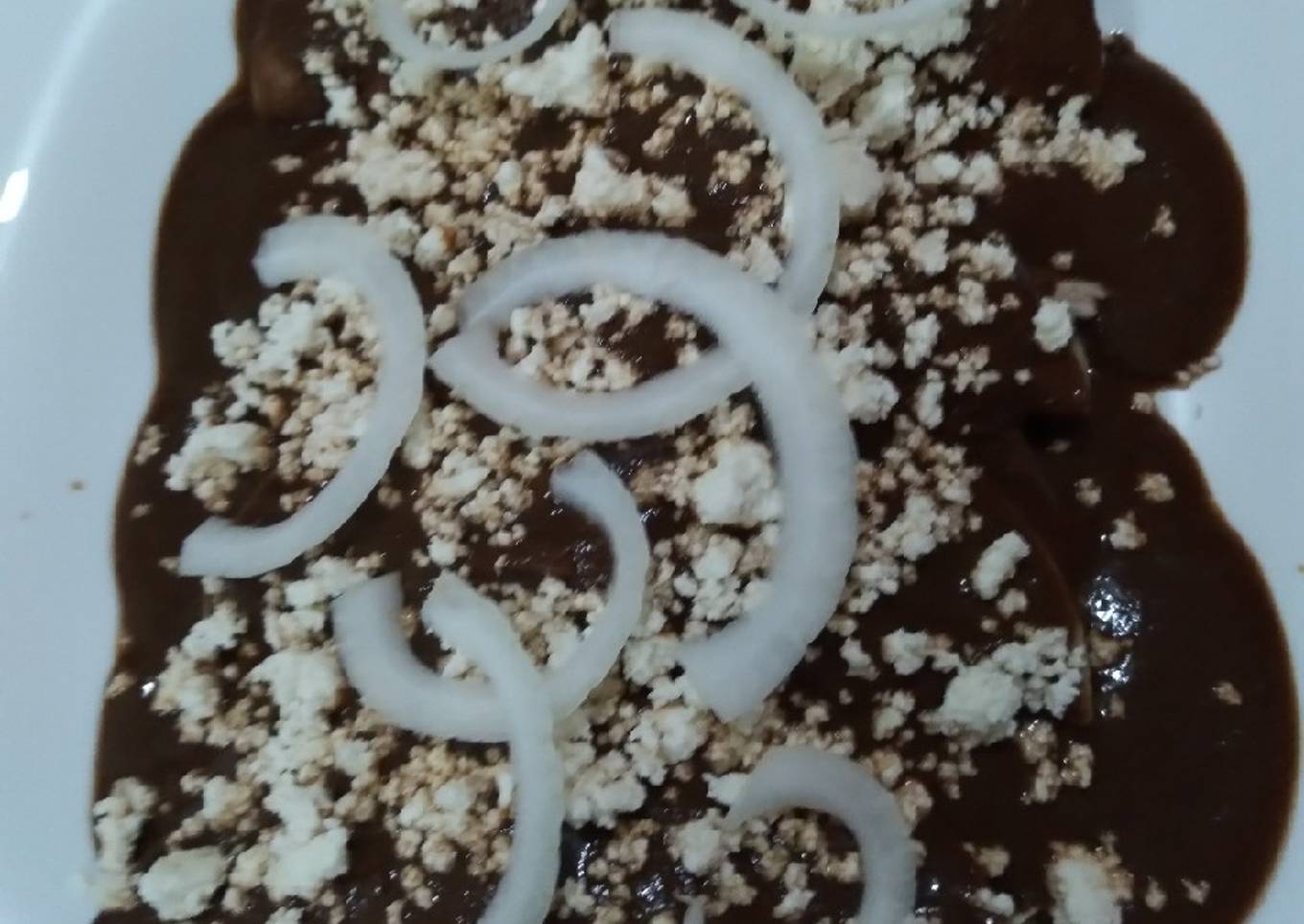 - Ya bañadas de mole agregar el queso rallado, la cebolla y poner crema al gusto.