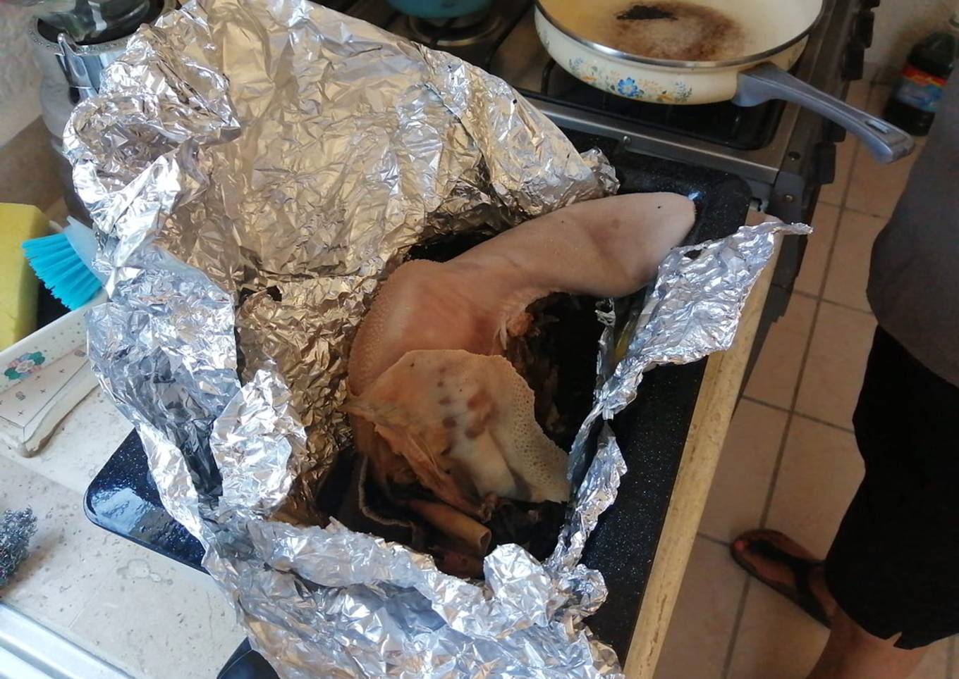 - Se envuelve la lengua muy bien con el papel de aluminio, de manera que quede bien sellada.