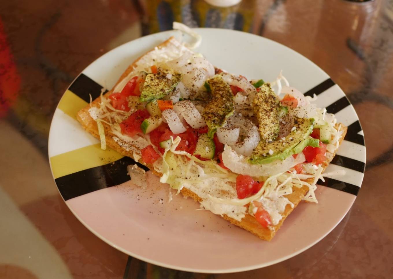 - Le pones un fondo de crema, un poco de repollo, pepino, jitomate, cueritos, aguacate, sal y limón al gusto.