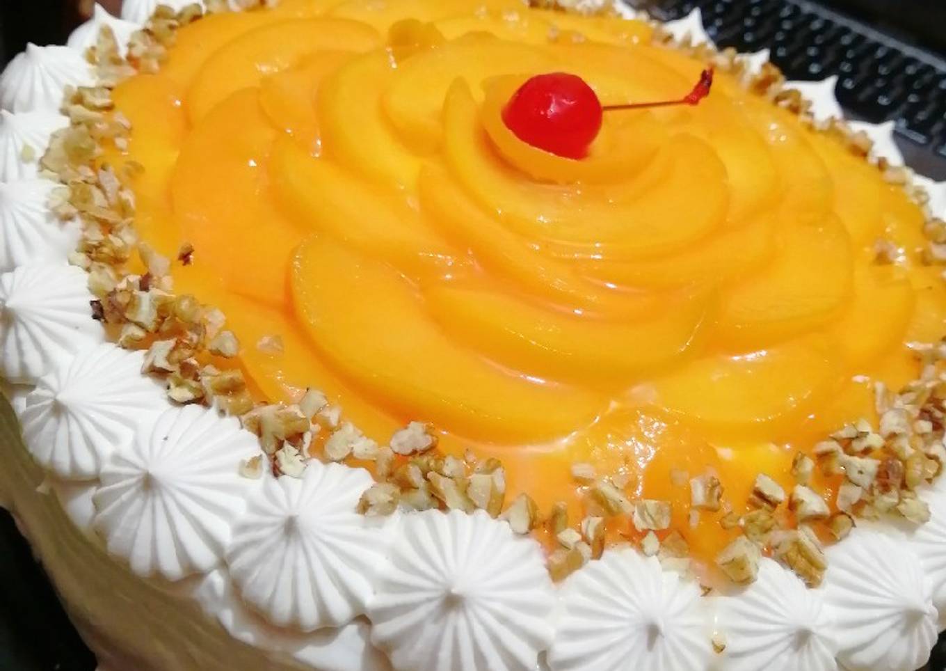 Dividir el pan en dos o tres dependiendo de grosor del bizcocho. Remojar con las tres leches, rellenar con duraznos y un poco de crema.