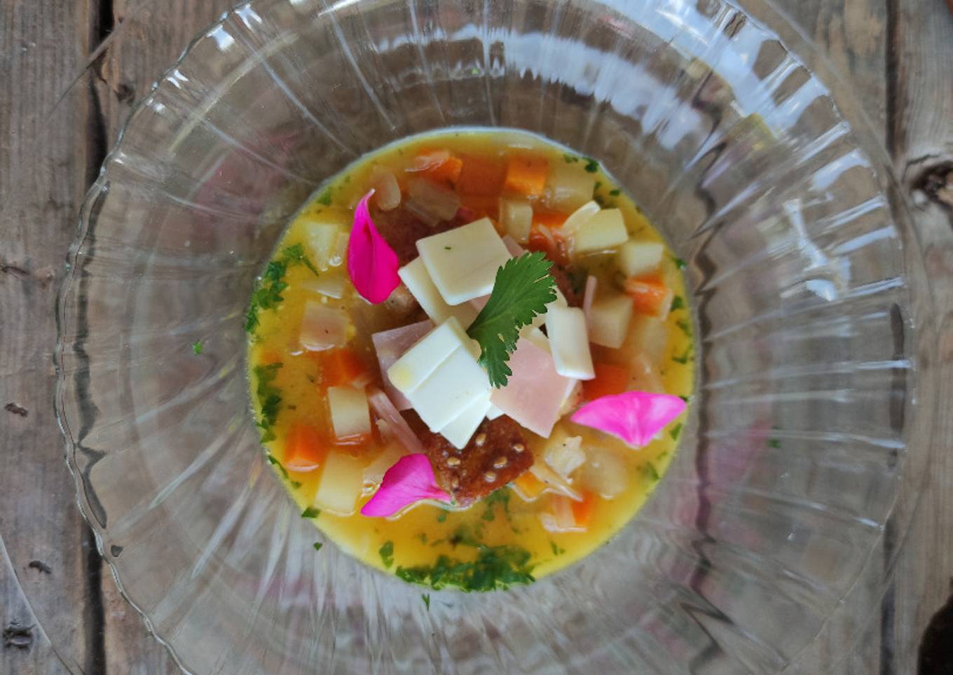 Picar los vegetales brunoise (cubos muy pequeños), cortar el queso y el jamón en small dice.