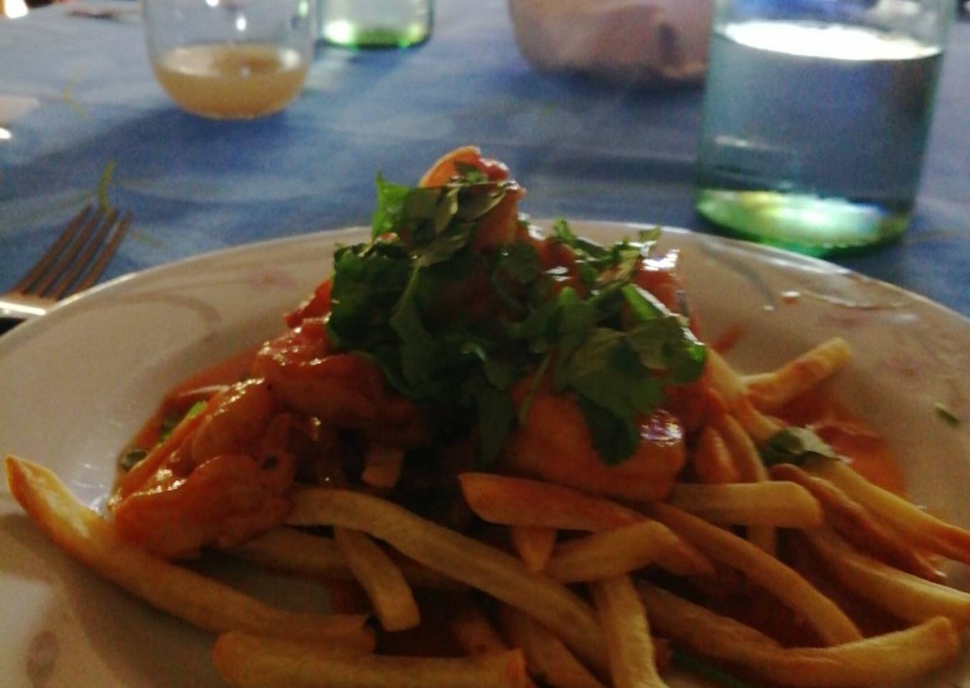 - Las papas se fríen y se reservan, mientras en el aceite se ponen los camarones con su marinada a que cambien de color, se le agrega la salsa inglesa y el vino, se evapora el alcohol, se agrega la salsa de tomate, se deja hervir un minuto, se agrega el jugo de limón y se apaga el fuego.